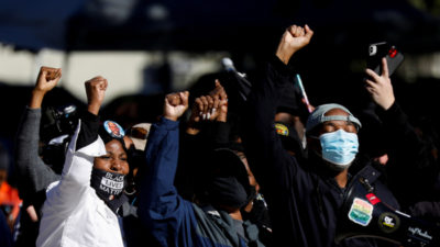 People react outside the Glynn County Courthouse after the jury reached a guilty verdict in the trial of William “Roddie” Bryan, Travis McMichael and Gregory McMichael, charged with the February 2020 death of 25-year-old Ahmaud Arbery, in Brunswick, Georgia, U.S., November 24, 2021. REUTERS/Octavio Jones