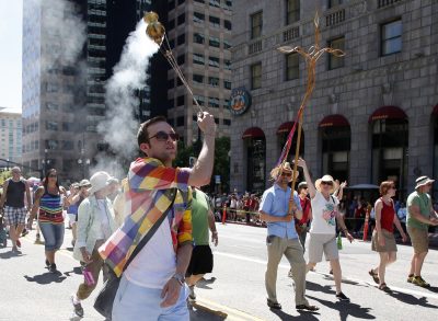 Charlie Knuth (front L)of the All Saints Episcopal Church swings a censer as he marches in a gay pride parade in Salt Lake City, Utah, June 2, 2013. Both Mormons and members of the Boy Scouts marched with members of LGBT community and their supporters as part of the Utah Pride Festival. REUTERS/Jim Urquhart (UNITED STATES – Tags: SOCIETY RELIGION) – GM1E9630AP401