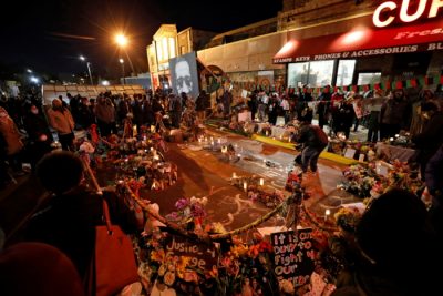 People observe the memorial to George Floyd after the verdict in the trial of former Minneapolis police officer Derek Chauvin, found guilty of the death of George Floyd, at George Floyd Square in Minneapolis, Minnesota, U.S., April 20, 2021. REUTERS/Octavio Jones – RC230N9E3OBF